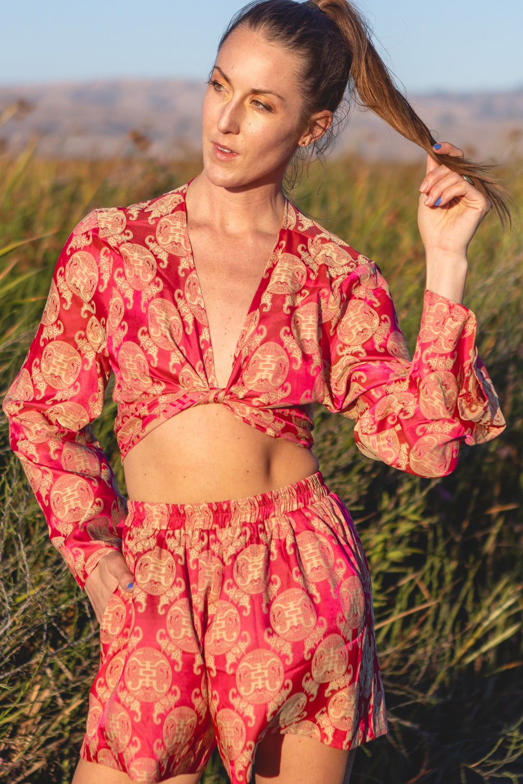 Elevate your resort wear with our Manila Silk Set. Made from luxurious silk, this set features a long straight sleeve crop wrap top and shorts with an elastic waistband and pockets for added convenience. These can be worn as a set or as separates. Perfect for a day by the pool or a night on the town, feel confident and stylish in this must-have ensemble.